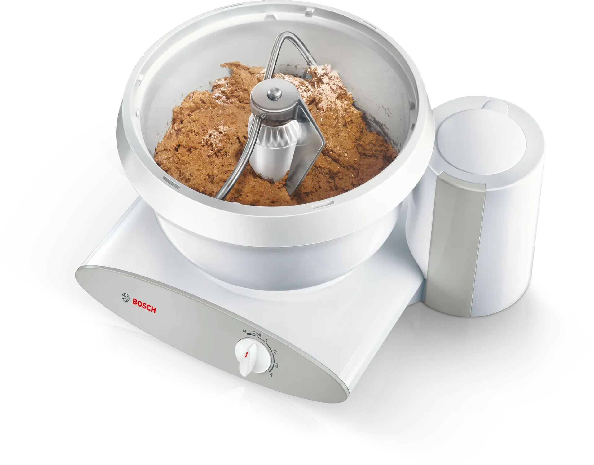Other stand mixer jobs are done with a separate set of bowl and tools; in this case, as I mentioned above, the mechanism is more-or-less identical to that of the Bosch. After removing the bowl, you insert a plastic shaft into the motor and then set the donut-shaped bowl (made of clear plastic or, as a separate purchase, stainless steel) over it. Wire-whisk beaters and "paddles” (which are also made of stiff wire loops) attach to the top of the shaft and rotate around the inside of the bowl. While the 3.5 liter bowl isn’t as capacious as the mixing bowl, the tools work flawlessly, whether whipping cream or eggs or beating butter and sugar together. (If, as with many cookie and cake recipes, the process does not require high-speed incorporation of air into the batter or dough, you can instead use the scraper/roller combination to do the work, which gives you a full 7 liters of space to work with.)
