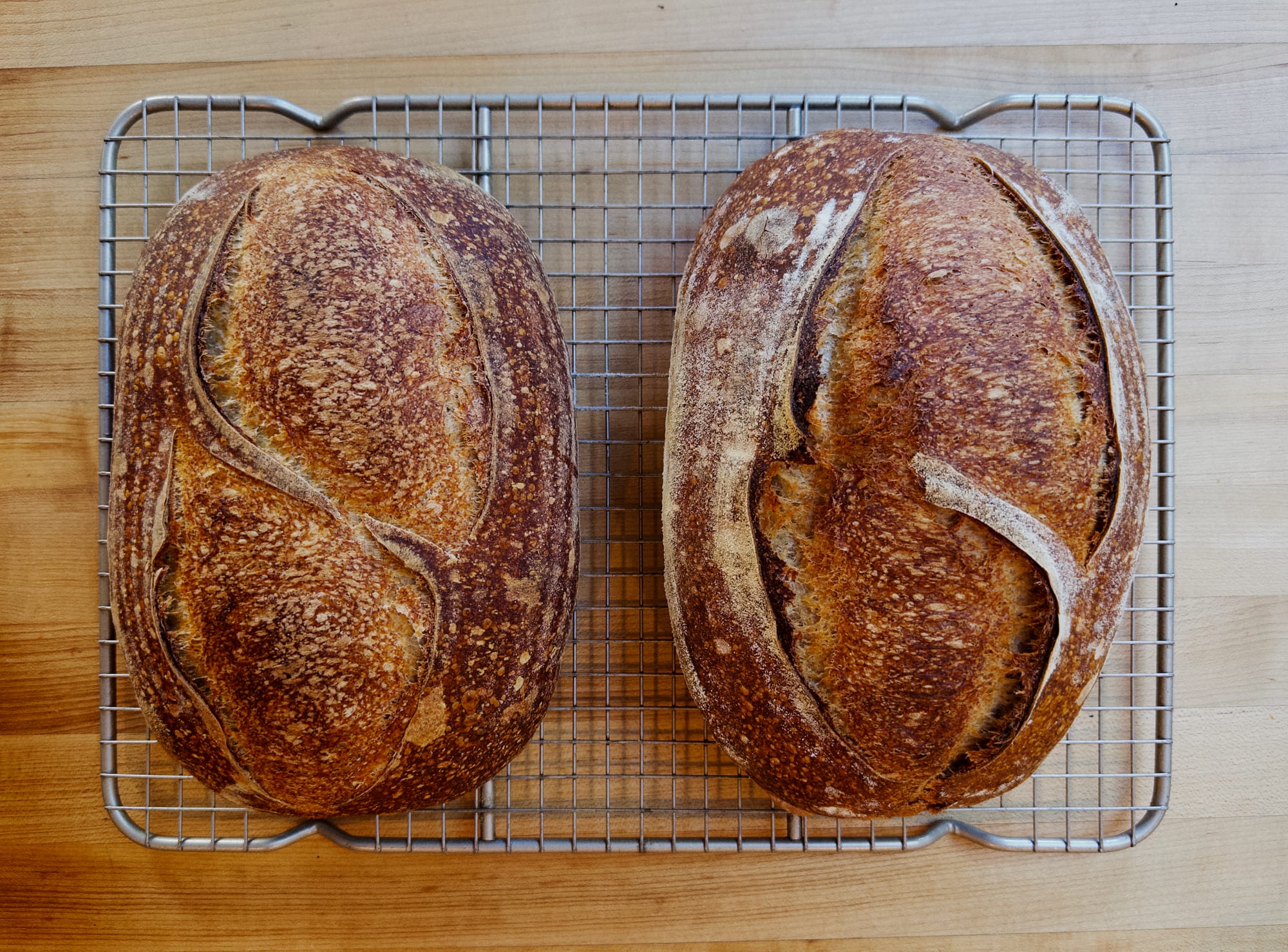 Once I figured this out, I put the theory to the test: I made two sourdoughs, one using my favorite Type 80 flour, and another with a 70:30 blend of soft bread and whole-wheat flour, and got these: