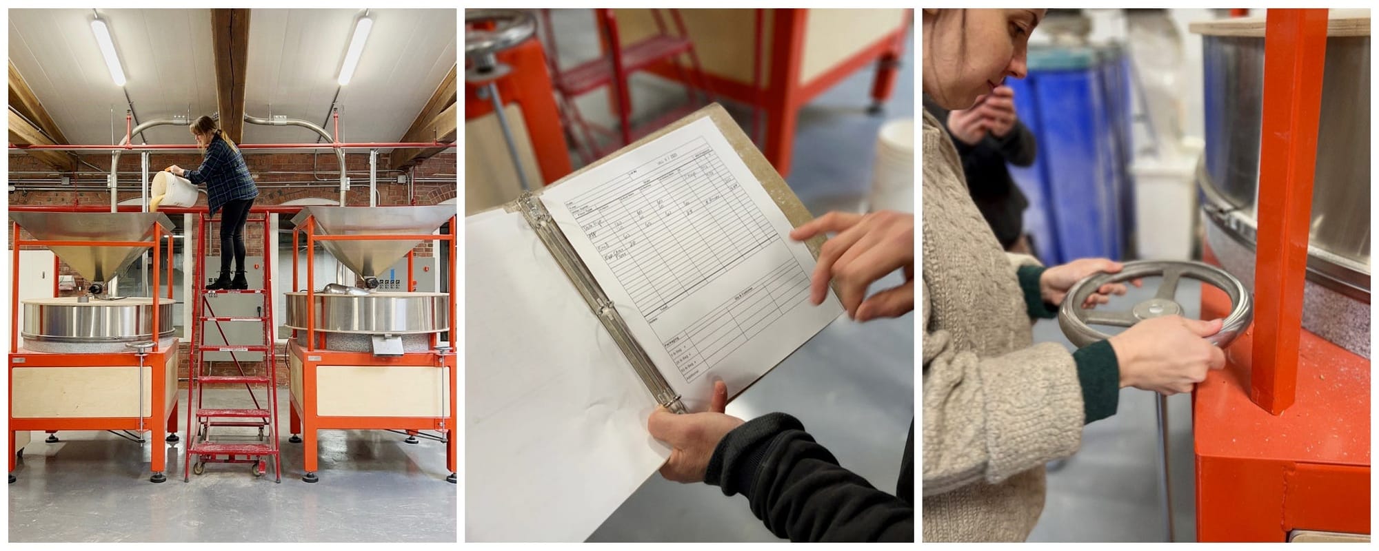Ground Up owns two New American Stonemills 48-inch mills1. While we were there we also got to do some milling of our own. Ground Up is considering offering a cocoa-based “chocolate” flour, and we got to help mill and blend three possible ratios, a portion of each we got to take home to evaluate in our own recipes. (I used mine in that choco-cherry sourdough so many of you have made recently.) While I’ve been to many bakeries that use New American mills and have spent a bunch of time at New American itself, this was the first time I got to actually play with one. And it was loads of fun. I have neither the need nor the space for a mill like that, but I can’t say I didn’t fantasize just a little about having one someday, somewhere.