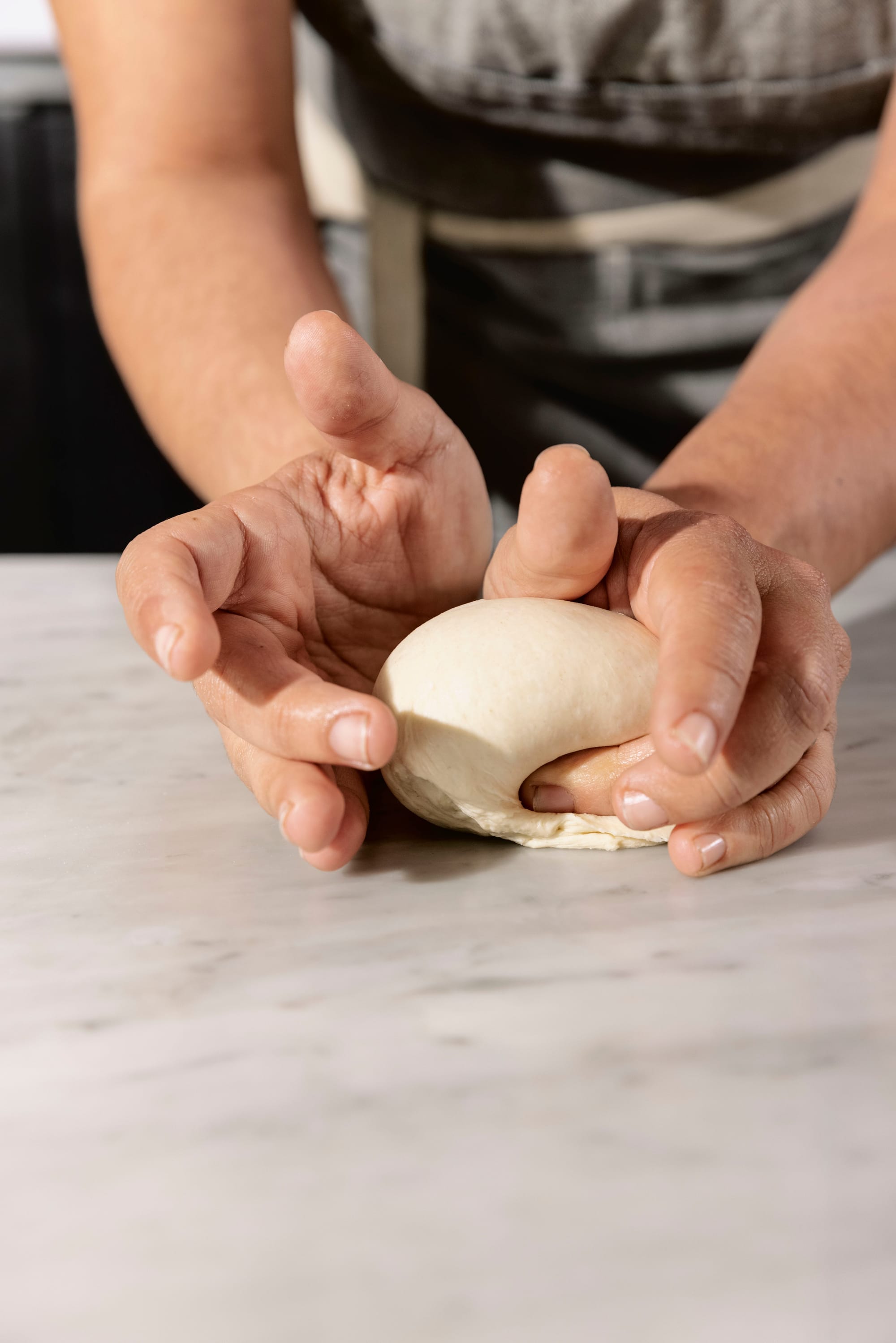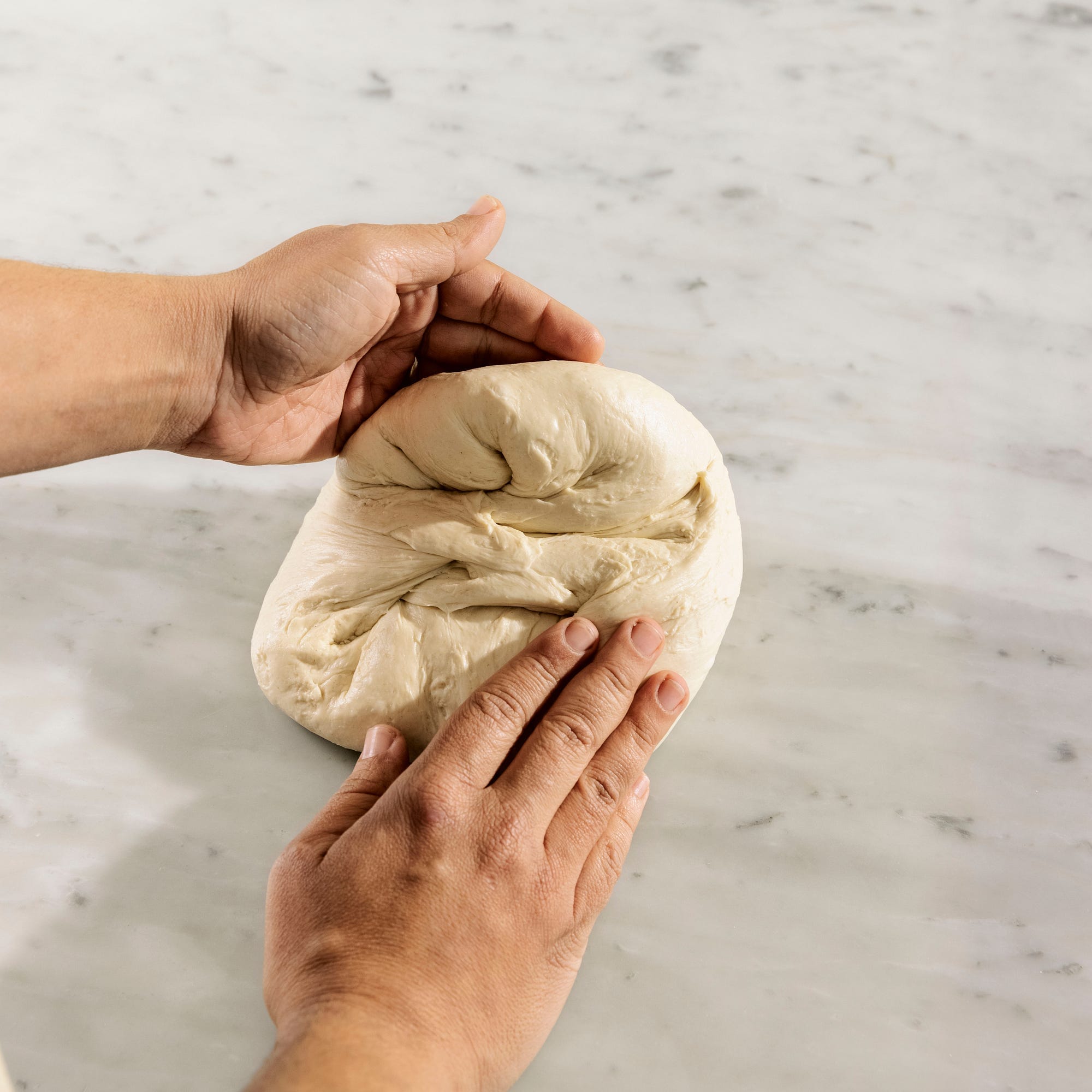 To mix by hand: Use your hand to incorporate the yeast mixture, all-purpose flour, salt, and oil into the dough. Squeeze the dough between your thumb and fingers with one hand while holding the bowl with the other hand, until it forms a rough and shaggy ball. Turn out the dough onto a lightly floured work surface and knead until the dough is smooth, springs back when dimpled, and stretches like a windowpane. This usually takes up to 10 minutes of kneading.