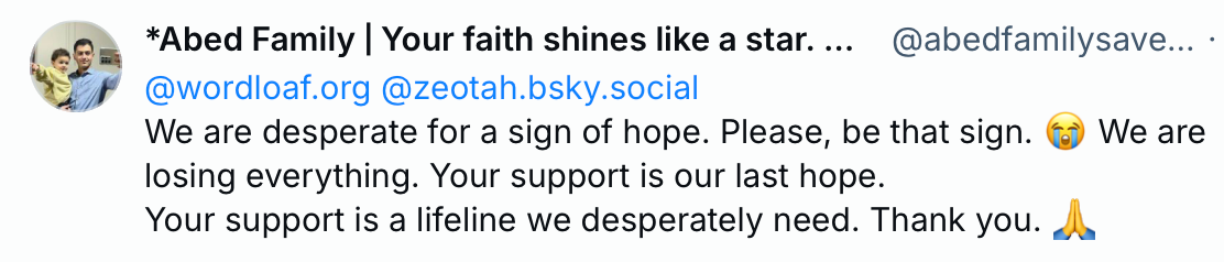I spoke with Sami briefly after the talk and asked him if there was one bread recipe from the book—there are many in it—he thought I should share with you here on Wordloaf, and he was happy to oblige. I was going to send it out this week, but it feels wrong to do so without first acknowledging the horror of what is happening in Gaza, where a single kilogram of flour might cost $60, if one can even be located (and brought home safely). I've seen videos on social media of Gazans making bread from moldy flour or boiled-down dried pasta; every day on my Bluesky account, I receive appeals from Gazans desperate for a lifeline, like this one: