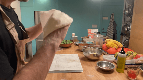 I then lift the dough in my hands and stretch it most of the rest of the way on the backs of my knuckles. This motion in particular requires the most practice, because it doesn’t involve much effort at all, and it tends to happen fast, so you have to be swift in getting it onto the peel to avoid it over-stretching or tearing. Once again, gravity does most of the work—you aren’t so much “stretching” the dough as you are letting just it droop gently over your closed fists.