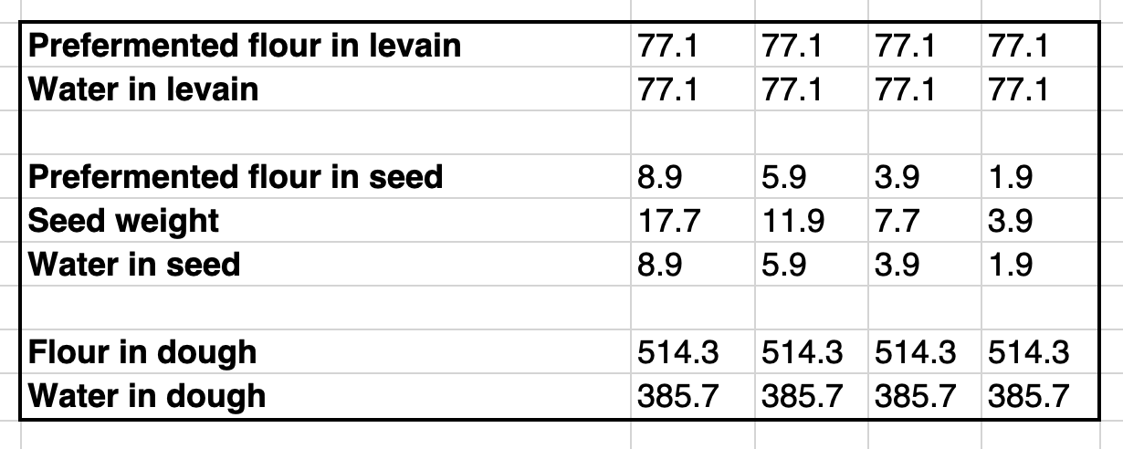 - The prefermented flour in the seed (i.e. the starter you use to build it) is the one element that has a variable in it, and it is a number that determines how quickly the preferment will proof. Each column has a different variable, depending upon the length of the fermentation. I’m using numbers here that are based upon those I’ve used before and on those from other baker’s formulas; these numbers will likely get revised as I work with the sheets longer, but they are a solid starting point.