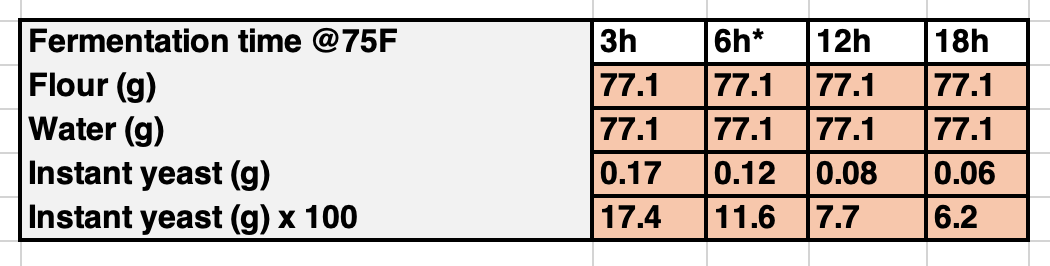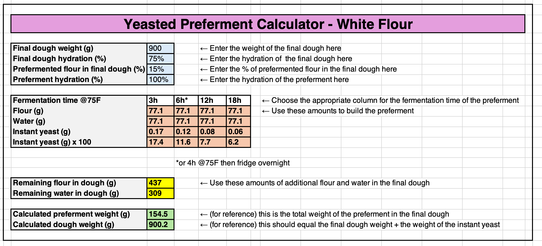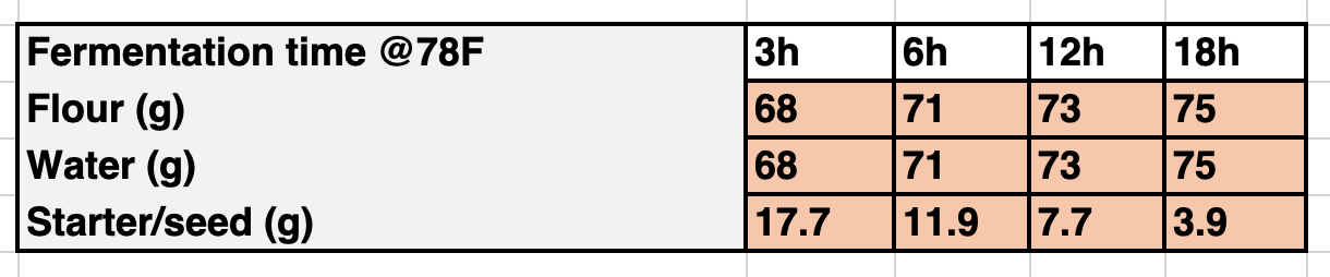 - The sheet then spits out four separate amounts of flour, water, and starter (or yeast), each of which yields a preferment that will ferment within a specific timeframe: 3, 6, 12, and 18 hours. (I never use the last one, but it might be useful for someone. I could add others as well, or instead create a drop-down menu that lets you pick a time frame, yielding only the desired formula, though I don’t know how to make that work yet.)