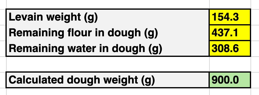 - At the bottom of the chart are the calculated weights of the preferment and the final dough, which are mainly for reference, to be sure that nothing is wonky in the formulas.