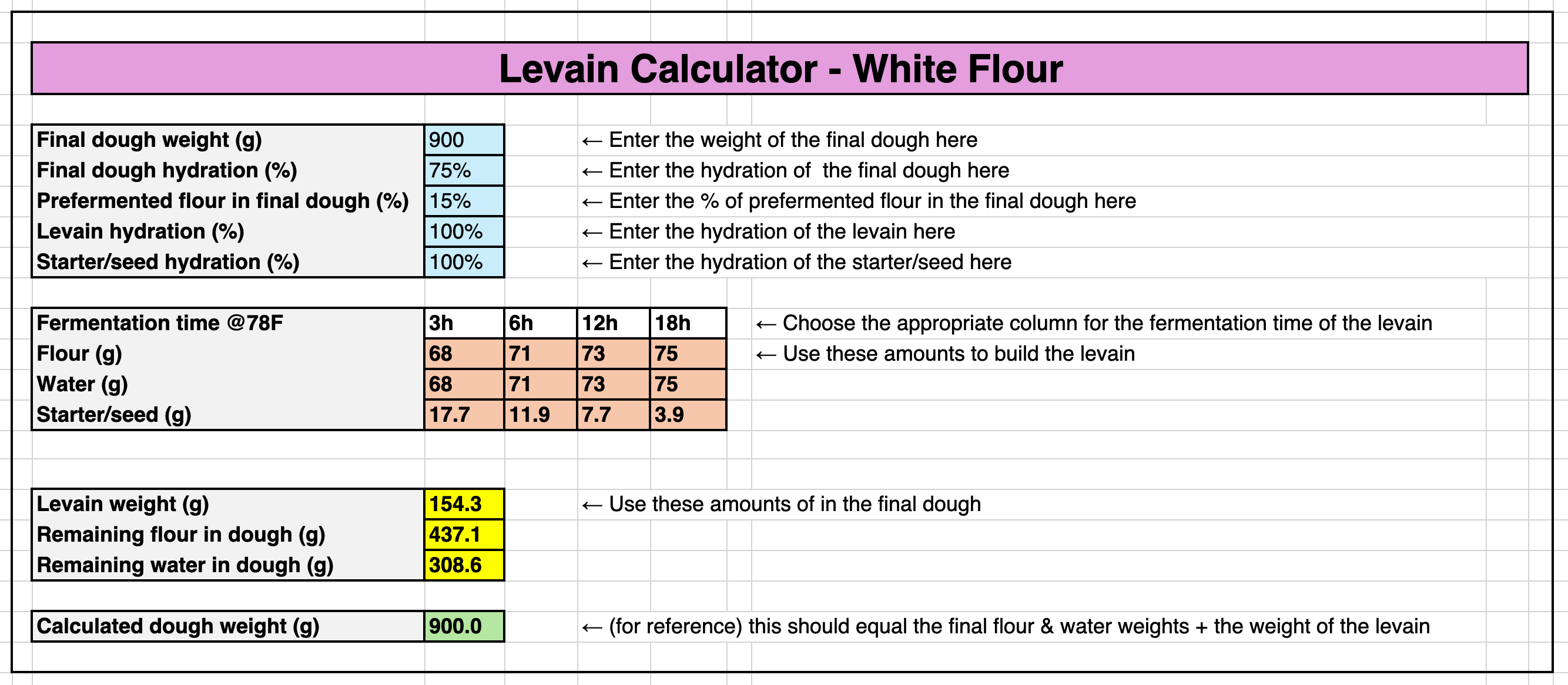 - Relative to the formula spreadsheets I normally use, this is the bit for me that these sheets fix—if you use a starter that is at a hydration other than 100% (as most formulas assume), it adjusts the amount of everything—the weight of the seed and the flour and water you add to it to get a levain of a precise hydration.