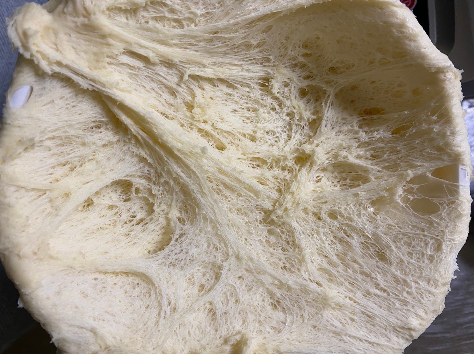 The second place that timing is important is in knowing when to stop the fermentation of your first dough. Here are some very important things I learned: If the first dough feels oily or greasy at any point during fermentation and it has a pungent acetic (vinegary) smell, this is usually indicative of it having undergone acidification. Additionally, if you tear open the first dough (as you see in the photo above) and you do not see a strong gluten network this is another sign that things have gone wrong and the gluten network has started to degrade.