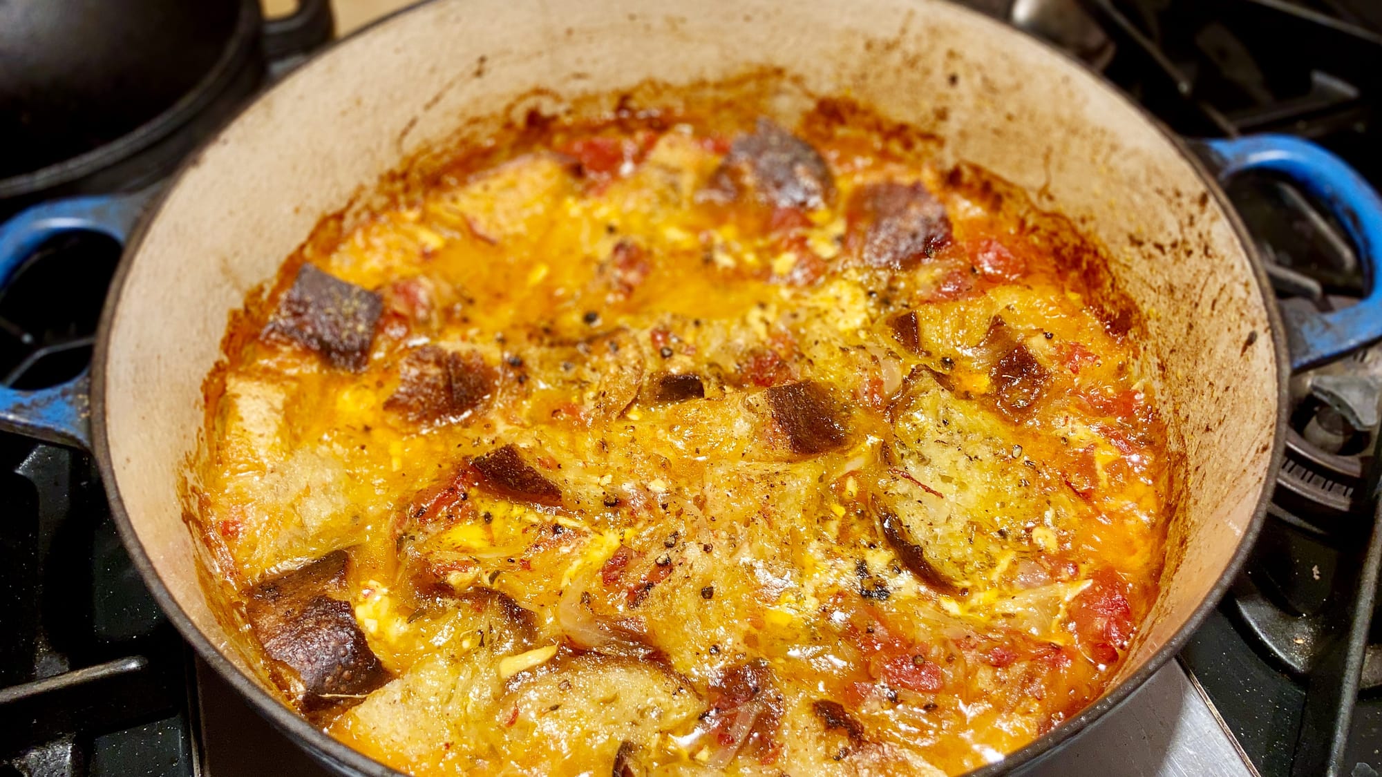 So the other day I finally had a chance to make something that had been kicking around in the back of my mind for awhile, and it was a resounding success: melding the flavors and elements of pizza—canned plum tomatoes, onions, garlic, mozzarella, Pecorino, and Parmesan—onto a panade.