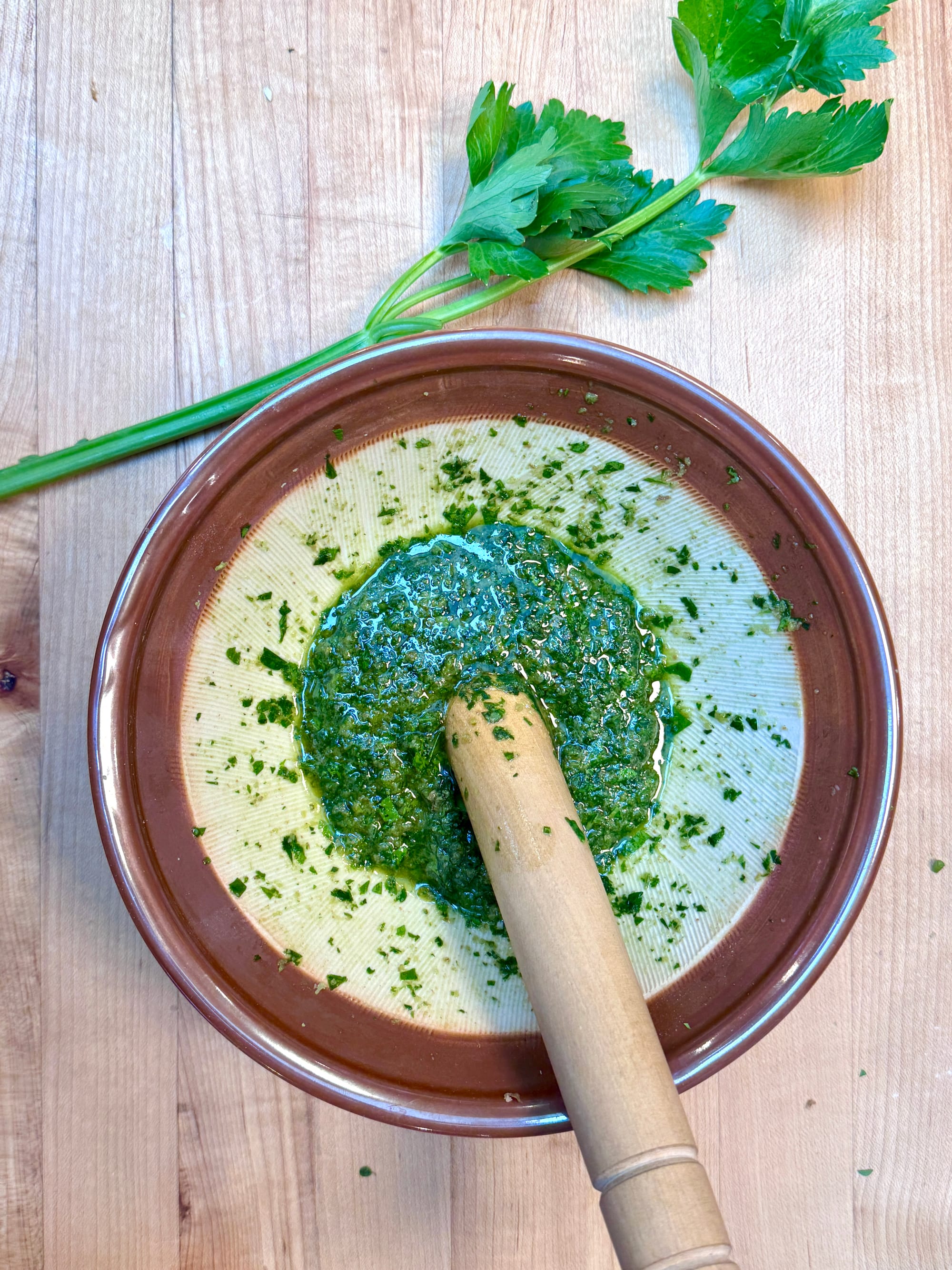 This is the recipe from Honey From a Weed, which is appropriately inexact, since it's the sort of sauce that encourages improvisation. I've been using leaf celery in place of the parsley, though just about any tender herb (or a combination) will work nicely. To make it vegetarian, omit the anchovies, or replace them with a teaspoon of fermented bean curd. Feel free to make it in a food processor if you don't have the time or patience to meditate over a mortar and pestle, just don't blend it too smoothly if you do. Gray recommends it as an accompaniment for poached or grilled fish or boiled meats, but it makes for a nice dip for crusty bread or as a spread for sandwiches too (at the very least). Refrigerated, it will keep for at least a few days.