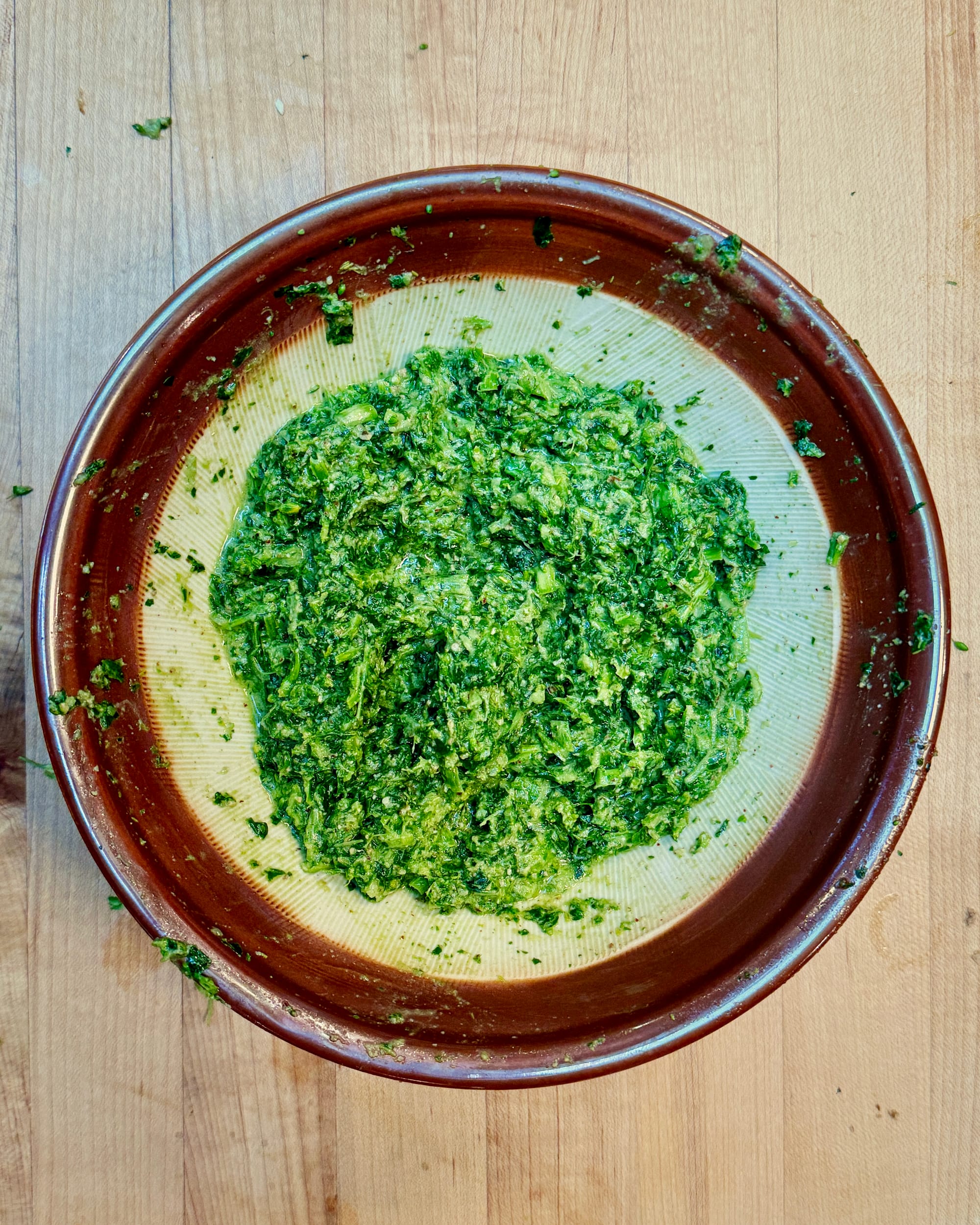 Start by mashing a garlic clove, a pinch of coarse salt, and a splash of olive oil until smooth, then add an umeboshi—Japanese pickled plum—or two (a blob of kimchi or a pinch more salt will do, if absent) and continue mashing. Then add a handful of toasted nuts—pine, walnuts, almonds, etc.—and keep going. Once everything is reduced to a coarse, even paste, add shredded or chopped greens (and herbs) a handful at a time, along with some acid—lemon juice or ume vinegar, for example—and enough additional oil to keep the mixture loose as you work. Once the greens and herbs have been incorporated and reduced to a paste—4 shredded cups or so—season with additional salt, acid, and olive oil to taste. It should be loose and smooth and flow just a little, if it's dry, thin with a little water. Serve within a day or so, preferably at room temperature.
