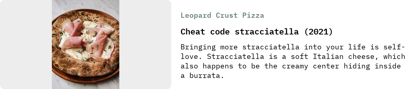 Pizza maven Feng Chen (aka Leopard Crust) has a recipe on her website—alongside a couple of must-try pizza dough formulas—for something she calls “cheat code stracciatella”, which is basically a trick to convert low-moisture mozzarella into a faux-but-authentic-looking stracciatella, which, if you do not know it, is the stringy and delicious precursor to fresh mozzarella and burrata. I haven't tried it yet, but it’s high on my list now.