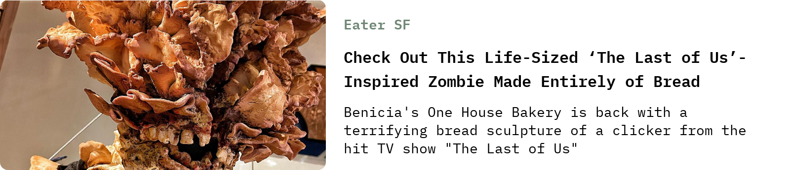 Eater SF documented the horror that is Benicia, CA’s One House Bakery’s recreation of a life-sized “clicker”, from HBO’s zombie-virus drama The Last of Us, made entirely of bread:
