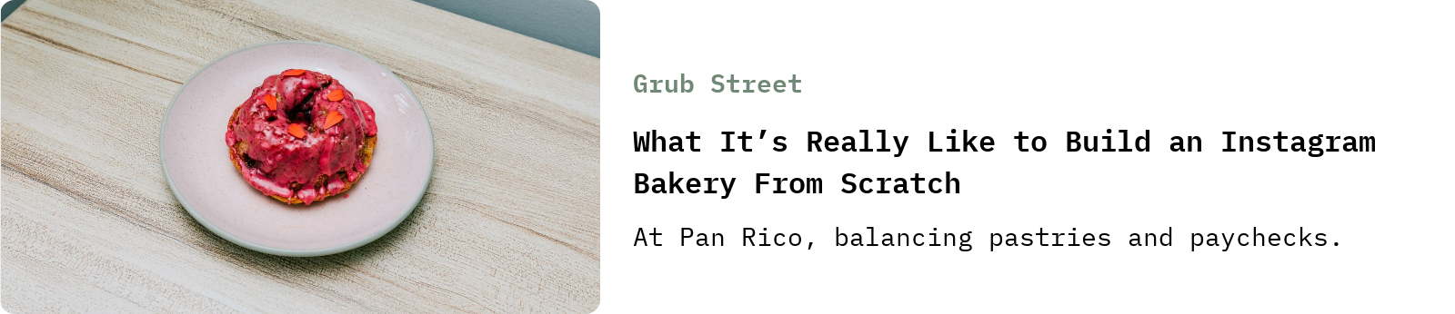 Next, there is Chris Crowley’s story about bakery Pan Rico in Eater. It’s all about the challenges that chefs and partners Eva Ramirez and Javiar Hernández have faced trying to turn their Queens, NY Mexican pan dulce apartment pop-up into a successful business. (You know how much I love a good apartment bakery story.)