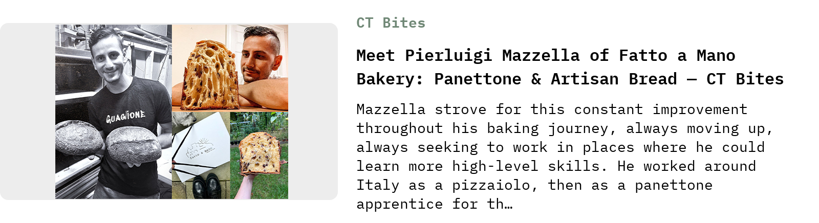 Finally, there’s this CT Bites story from Brian Lance (yes, the same Brian Lance who wrote the pan de muerto story for us), all about Pierluigi Mazzella—the former lead bread baker at Atticus—and his Monroe, CT cottage bakery Fatto a Mano, which specializes in pannetone from his native Italy: