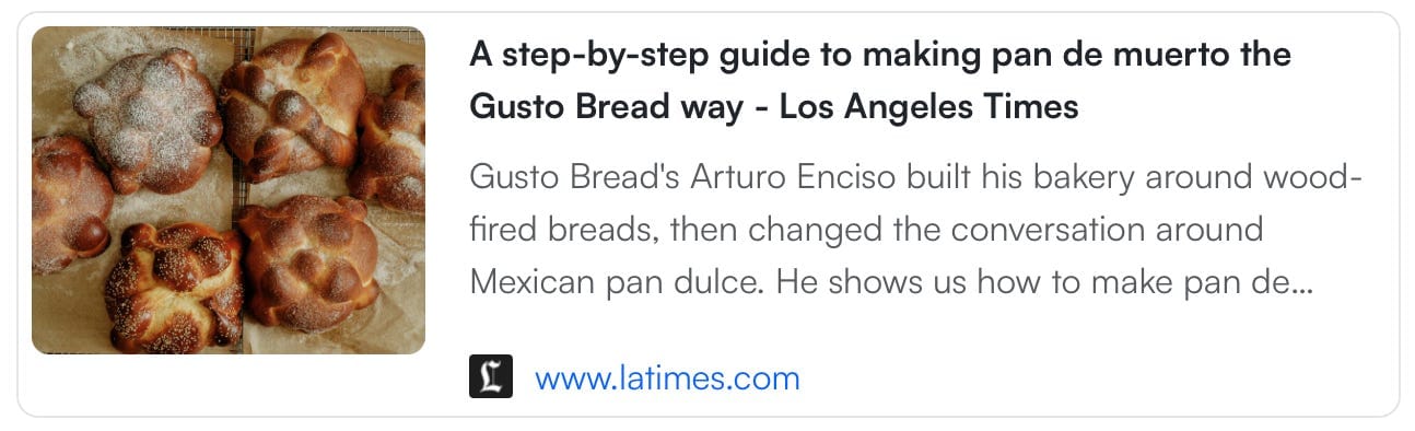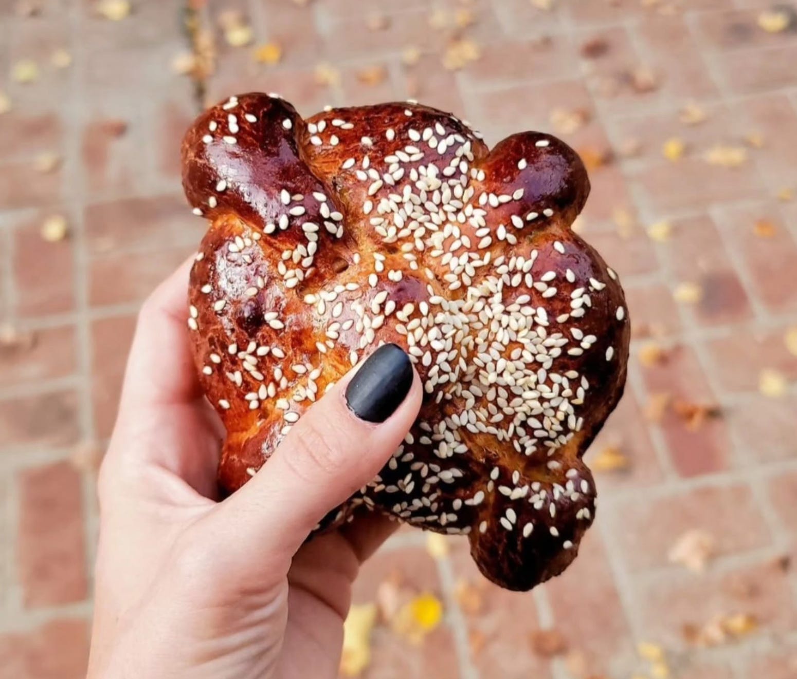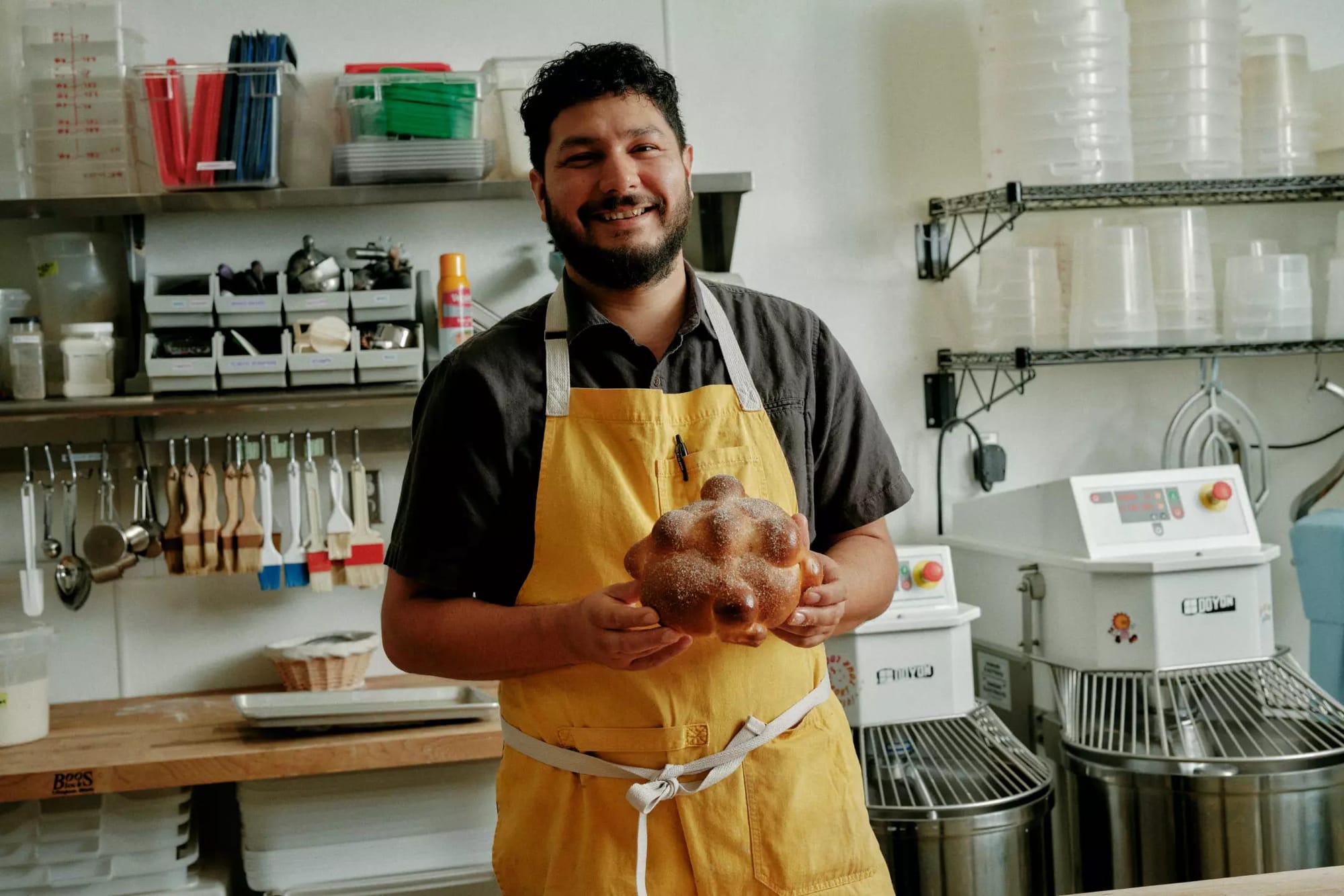 “Pan de muerto is an exploration in my cultural background,” says Enciso, who grew up in Lebec, Calif., and moved to Long Beach after high school. He taught himself to bake in a wood-fired cob oven, turning out pain au levain and baguettes. Initially, he and his partner, Ana Belén Salatino, operated Gusto Bread from their living room, then opened the bakery on Retro Row in 2020.