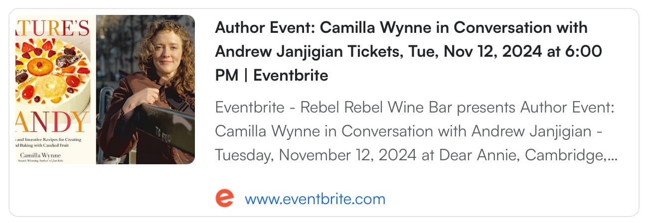 And for those of you within driving or biking distance of Cambridge, Camilla and I will be having a conversation about her book at Dear Annie wine bar on 11/12. Please come, there will be treats from the book (maybe even some made by me?!)