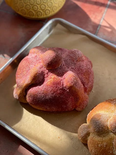 Pan de muerto (bread of the dead) is an annual bake for panaderías and Mexican panaderas in Mexico and the diaspora. The arrival of the loaves in Mexican bakeries everywhere ushers in Día de los Muertos; occurring on the 1st and 2nd of November, the holiday is a celebration and remembrance of the dead by their living. People create ofrendas, memorial altars, that are meant to be a welcoming, a tangible prayer to our loved one’s spirit gone to another realm.