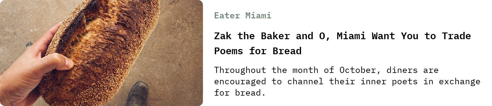 All this October, Miami’s Zack the Baker is giving away free loaves of bread in exchange for original poems about the city’s food: