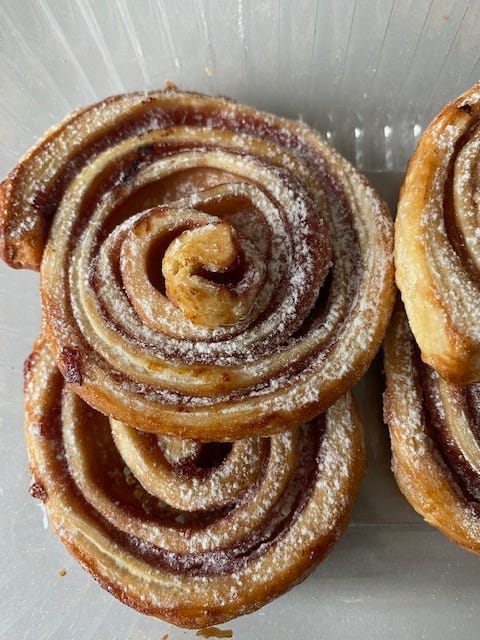 Yet rugelach in the UK is a different thing entirely. Across London there are nuances that depend on the bakery’s community, as well as the personal history of the individual baker. The most commonly found fillings are chocolate, cinnamon and vanilla, while most bakeries produce a yeast-enhanced, laminated dough, like the original Eastern Europe variations. The word ‘rugelach’ can sometimes mean different things in different bakeries: in some it signifies a shape and filling but can be as large as a croissant; in others, ordering ‘rugelach’ can simply refer to any miniature-sized pastry. Some bakeries offer ‘flaky rugelach’ made from unyeasted dough which is then rolled into spirals with fruit fillings. At others, the rugelach are so dense and squidgy with chocolate you’ll wonder if there’s any dough at all.