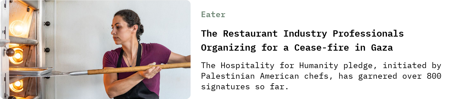 Hospitality for Humanity, organized by chefs including Reem Assil of Reem’s, Omar Anini of Saffron De Twah, and Marcelle Afram of Shababi, in partnership with Jewish American chef activist, Ora Wise, and Asian American food writer and land worker, Kimberly Chou Tsun An, is calling on industry professionals — chefs, servers, writers, and farmers alike — to sign on to their pledge to demand a cease-fire in Gaza, support Palestinian voices, and boycott Israeli products. The pledge has over 800 signatories so far, including well-known chefs like Samin Nosrat, Stephen Satterfield, Sohla El-Waylly, and Bryant Terry.