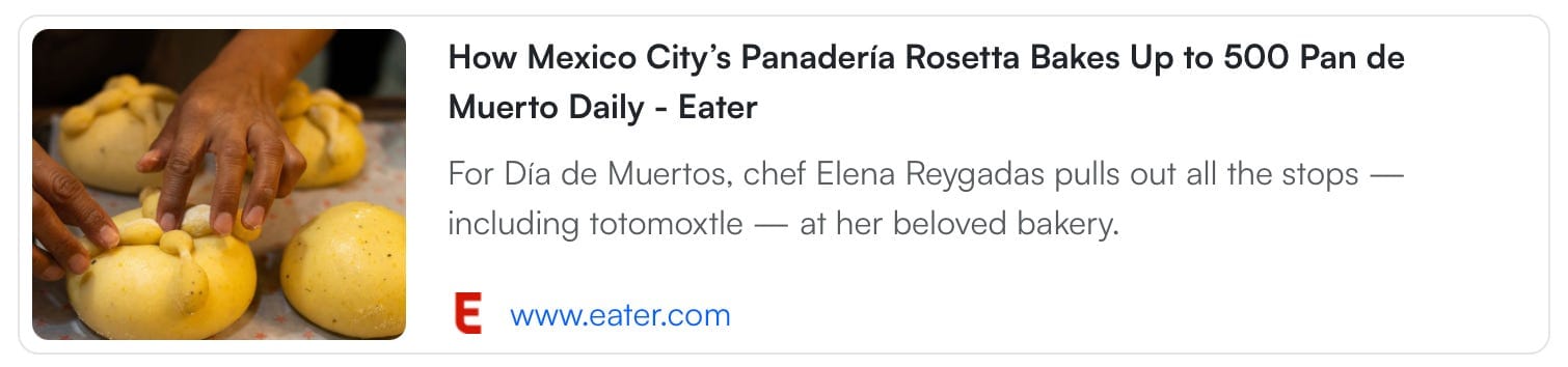 No recipe here, but here’s some more pan de muerto intel in advance of Día de Muertos tomorrow, in the form of this gorgeous Eater photo essay by Kisai Ponce and Leandro Motta on Mexico City’s Panadería Rosetta, which makes a black pdm using charred corn husks in their sugar coating: