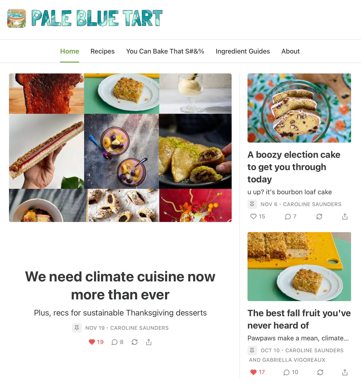 Finally, there’s Pale Blue Tart, which is not at all new, but one I should have recommended ages ago. On it, Caroline explores baking with climate-friendly ingredients and techniques, sharing recipes of her own and along with those of other bakers, many of whom she interviews (a chat with plant-forward pastry chef Philip Khoury is a recent highlight).