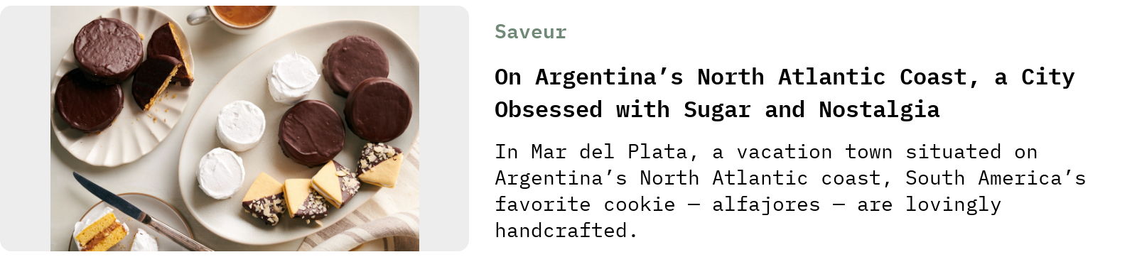 My friend Kevin Vaughn wrote & photographed a wonderful story for Saveur all about the Argentine city Mar del Plata’s industry of alfajores, filled sandwich cookies enrobed variously in chocolate or meringue, of which Argentinians apparently consume 11 some million per day: