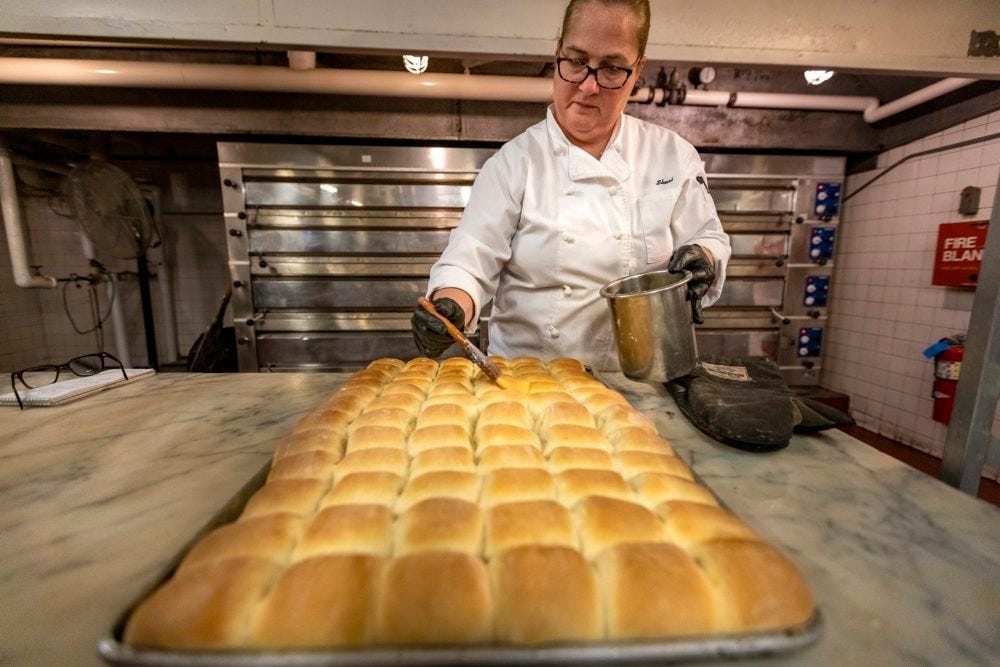 “Parker House rolls get hit with butter two, often three times,” baker Sheri Weisenberger explained as she lifted a few dozen glimmering pillows off a hot tray.