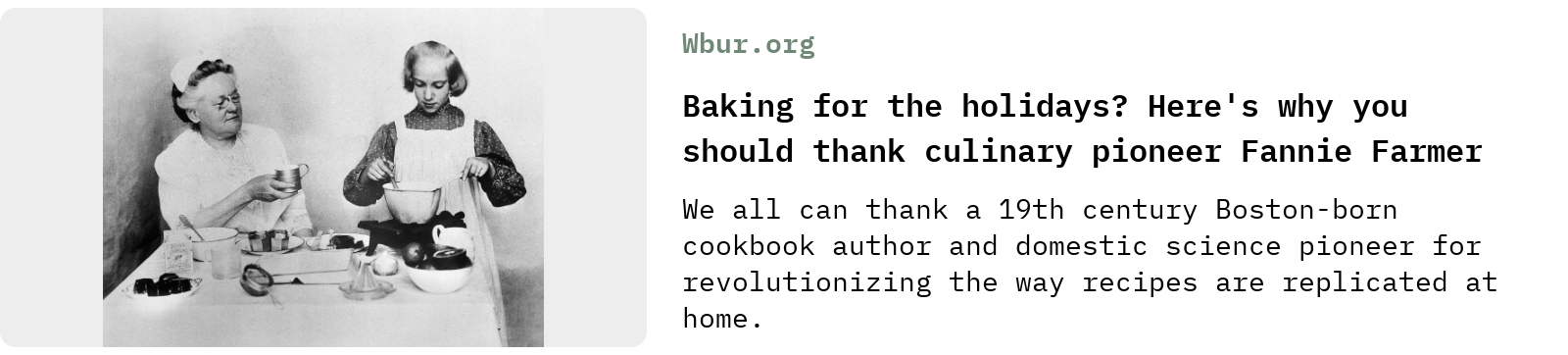 WBUR’s Andrea Shea shared a story about why we home cooks have Boston Cooking School Cookbook author Fannie Farmer to thank for the standardization of recipes and for her pioneering work in reverse-engineering a recipe for Boston’s beloved Parker House rolls: