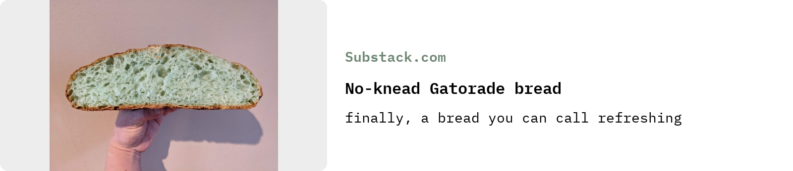 For this week’s newsletter, I decided to make my own version of no-knead bread by replacing a key ingredient, water, with a classic electrolyte-replenishing, thirst-quenching beverage: Gatorade.