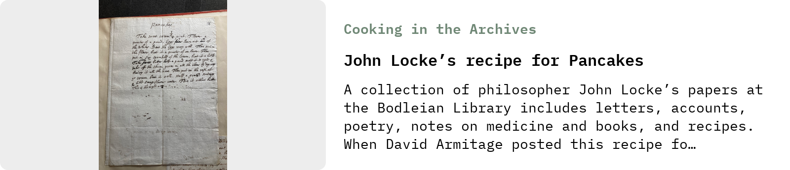 When historian David Armitage tweeted a photograph of a handwritten pancake recipe found in political philosopher John Locke’s archives in Oxford’s Bodleian Library, Marissa Nicosia—of the food history website Rare Cooking—decided to give them a try herself. Here’s the original recipe: