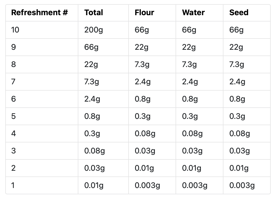 As you can see, the first refreshment would call for 3 milligrams of flour and water, and 3 tenths of a milligram of starter, something no device (or human, for that matter) could scale out accurately. And at a more reasonable 10:10:2 ratio? You'd need to start with 4 nanograms of starter (or 0.000000004 grams)!