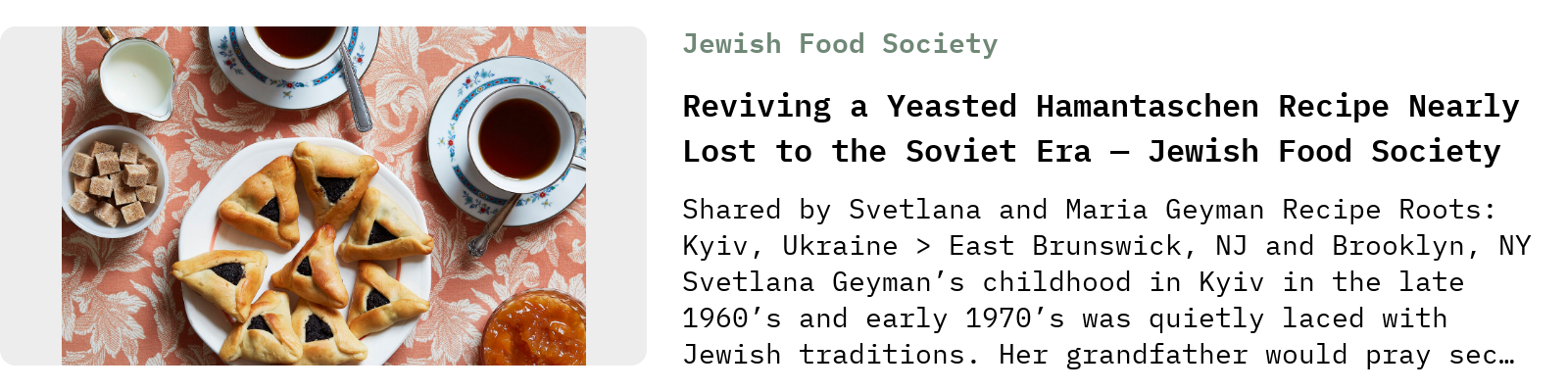 A Jewish Food Society post from last year tells the story of one Ukrainian family’s hamantaschen recipe (a yeasted one, which made it of particular interest to me) and how it was nearly lost to history: