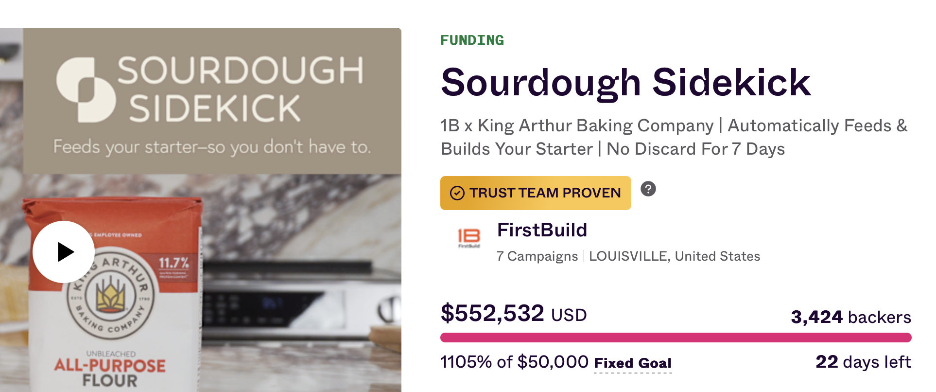 Welp. The Sourdough Sidekick, a tabletop device for automatically feeding a sourdough starter—which I wrote about with deep skepticism a few weeks ago—launched its crowdfunding campaign last week, and it has already overshot its goal by some $450k, with more than 3400 backers. I guess I'm not surprised that so many think they would want a device like this. Even if it works as advertised, though, I suspect most of the Sidekicks will end up going the way of the instant pot, gathering dust on a shelf somewhere once their users discover that success with sourdough requires attention, not automation. Once they do, they'll either find the time to give it that, or give it up entirely.