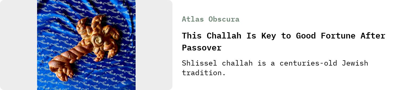 I loved learning about Shlissel challahs, the key-shaped challahs traditionally made as the first post-Passover loaves, in this Gastro Obscura story from Karen Chernick: