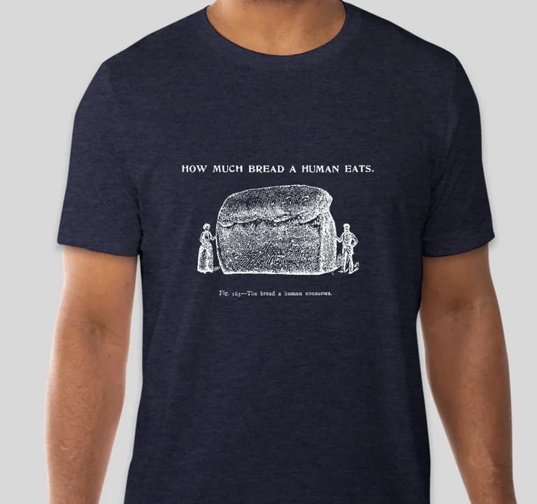 If you are interested in one, comment on the Instagram post or here, and stay tuned for the preorder sale announcement here. I’ll also be reordering my “How Much Bread a Human Eats” shirts (possibly in a new color) at the same time, in case you wanted one of those and missed out last time. (Both shirts will be available in unisex and women’s cuts.)