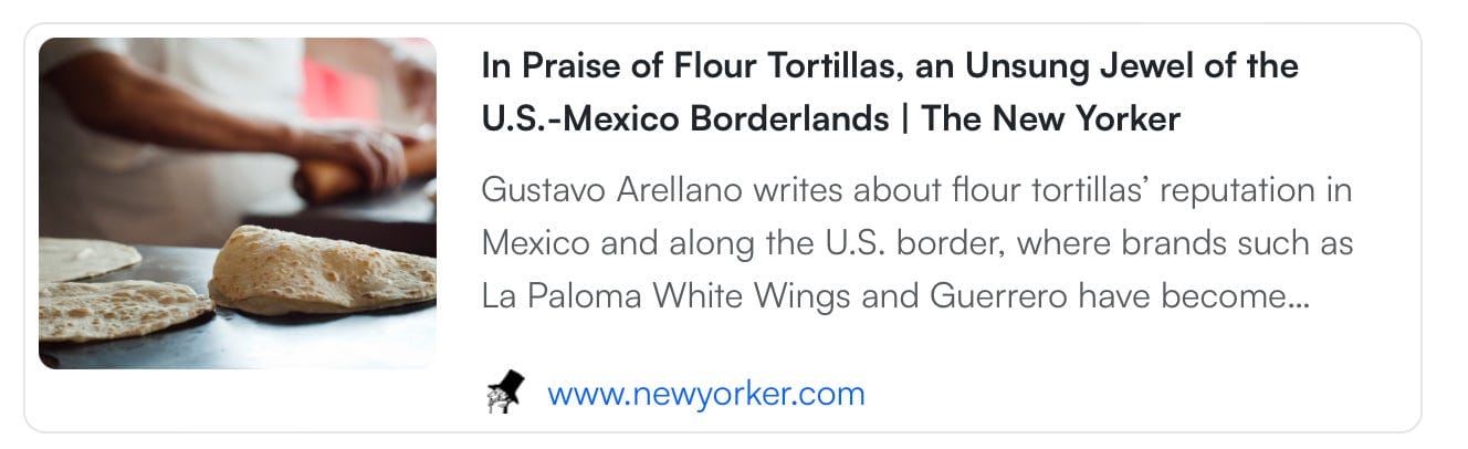 Gustavo Arellano writes at the New Yorker on the joys of flour tortillas, which don’t deserve their bad (w)rap: