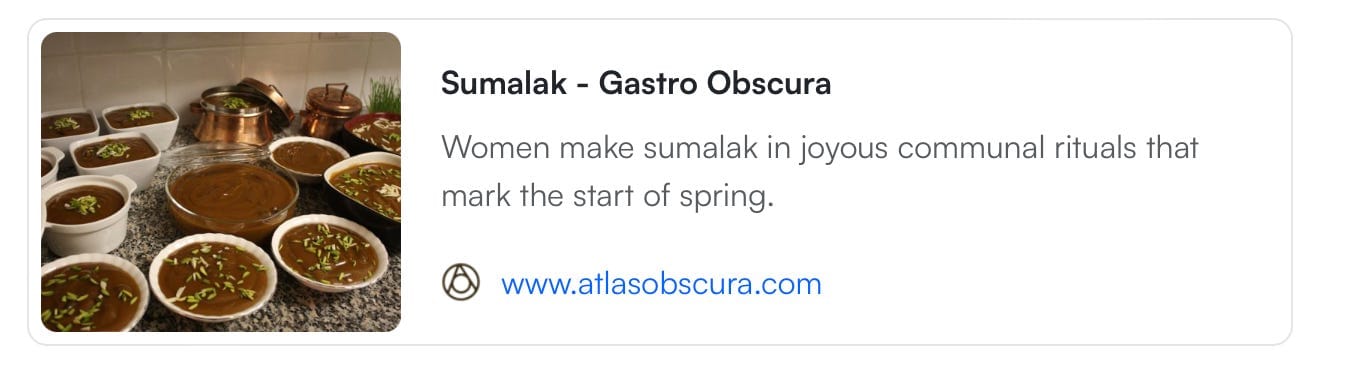 I just learned all about sumalak, a Nowruz (Persian New Year) pudding made by grinding sprouted wheat berries to a paste and cooking it long and slow until it caramelizes: