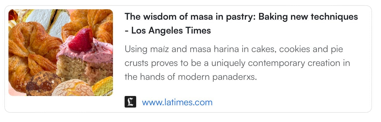For the LA Times, talked to bakers—including Arturo Enciso and Ana Belén Salatino of Long Beach’s Gusto Bread and friend of Wordloaf —about the incorporation of masa harina in their pastries and breads: