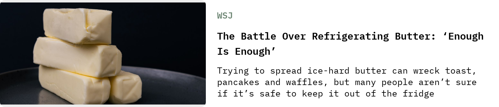 The Wall Street Journal’s Kristina Peterson profiled the state of the debate on whether you should be refrigerating your butter or not: