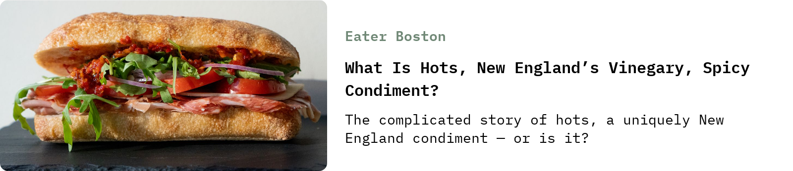 Eater Boston recently shared a nice exploration of the (mostly) New England sandwich condiment topping known as “hots.”