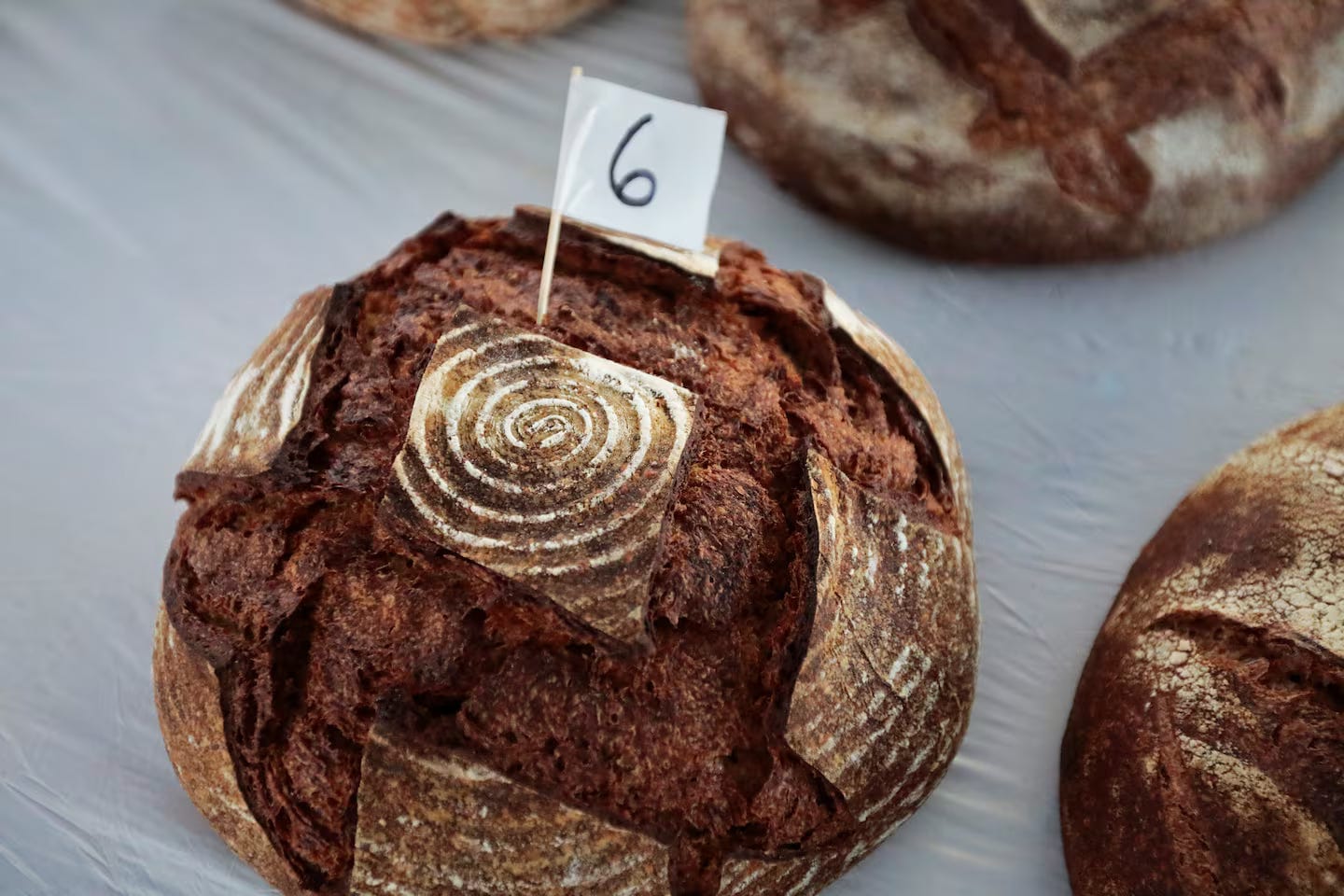 Each had to be made in a home kitchen, either in a freeform shape or baked in a Dutch oven, but not in a loaf pan. Weight had to fall between 1,000 and 1,600 grams (2.2 to 3.5 pounds). That’s a very large loaf; much larger than most home bakers are used to. At least 50 percent of the flour had to be unsifted whole-grain from a local mill. Elmendorf mills 23 New England and New York grains on site, which accounts for the deep interest in bread and willingness to host. Each entry had to arrive with an ingredient list and contestants had to live in Massachusetts or within 60 miles of Boston. The entry fee for contestants was $35, which covered the entire day’s festivities, including a lively Parisian street fair along Cambridge Street, which was bustling once the rain stopped and the sun appeared.