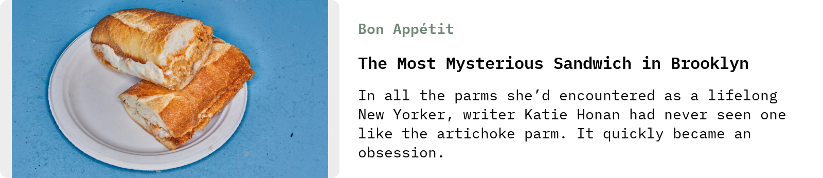 I loved this Bon App story from Katie Honan about a mysterious sandwich singleton, the artichoke parm from Mama Louisa’s Hero Shoppe, in Brooklyn. In wanting to learn more about this unique iteration of the parm sub, Honan does a deep dive into the history of the dish: