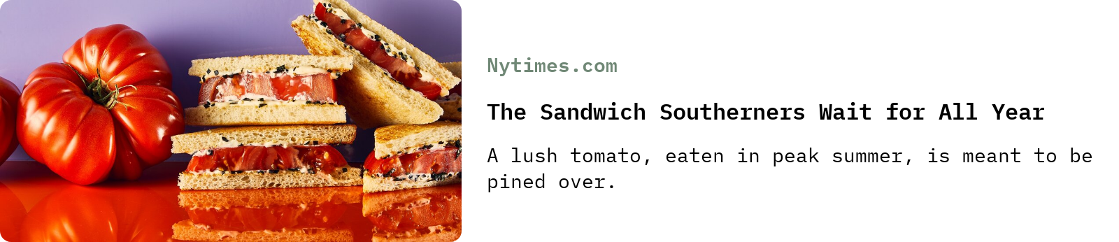 Eric Kim wrote about the joys of the tomato sandwich for the NYT Magazine, of which it is now high season. (Or about to be high season; where I am, the good farmer market tomatoes haven’t yet materialized.) Eric is from the South, where the tomato sandwich is a thing of special importance: