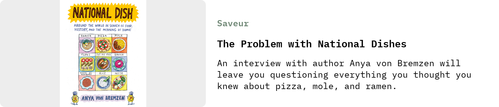 Saveur Magazine published a great discussion between Ben Kemper and Anya von Bremzen, all about her new book, National Dish, which explores the complicated and thorny questions around whether a food “belongs” to any particular nationality: