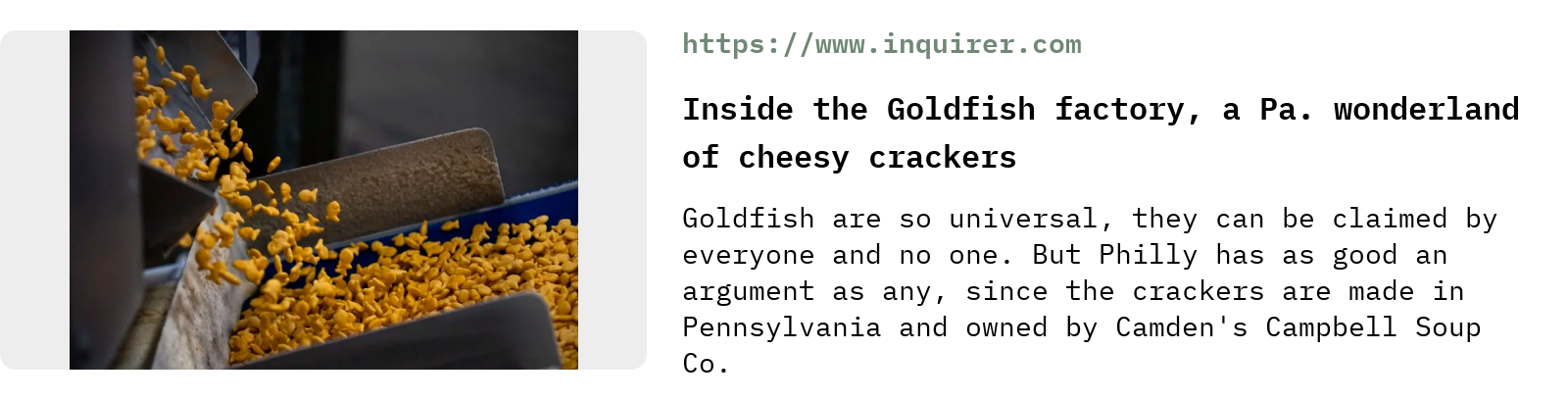 I loved this story from the Philly Inquirer about the Pepperidge Farm factory in Denver, PA, which makes 20% of the US supply of cheesy fish crackers. It includes a bunch of mesmerizing videos showing exactly how Goldfish are made and details about their origin story: