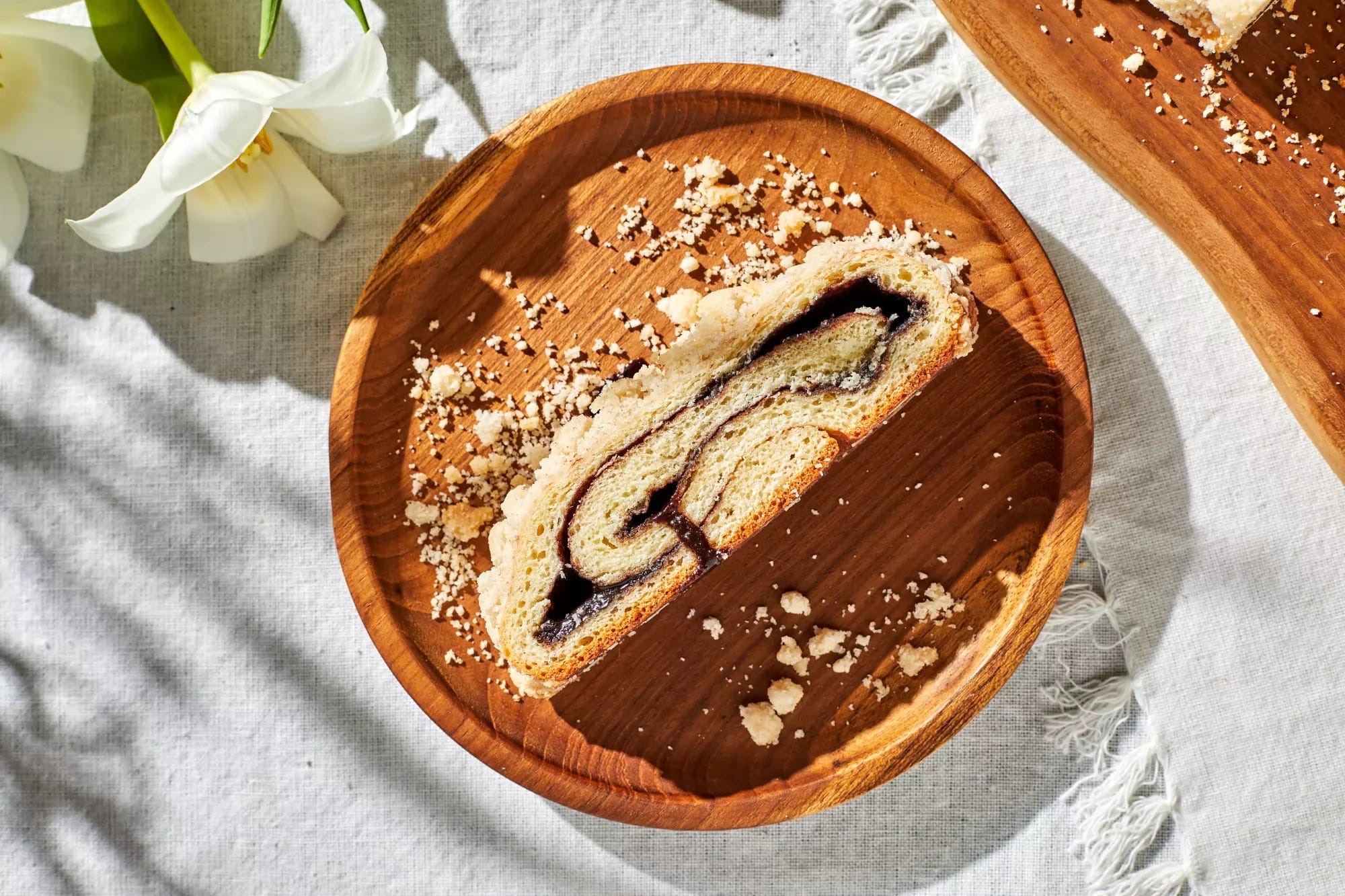 Sometimes referred to in Jewish bakeries as “chocolate-filled rolled strips,” kokosh — Hungarian for “cocoa” — is basically a mix between babka, which is often layered with chocolate, twisted and loaf-shaped, and strudel, which is a long loaf of thin pastry wrapped around a cooked filling. It looks more like a strudel, but the dough is yeast-raised and short, which means it has a high fat-to-flour ratio from the addition of butter. It is rolled with a chocolate filling into a spiral log that’s then baked golden brown. In Hungary, kalács are yeast-raised cakes; the name comes from Slavic koláč, which comes from kolo, meaning circle.