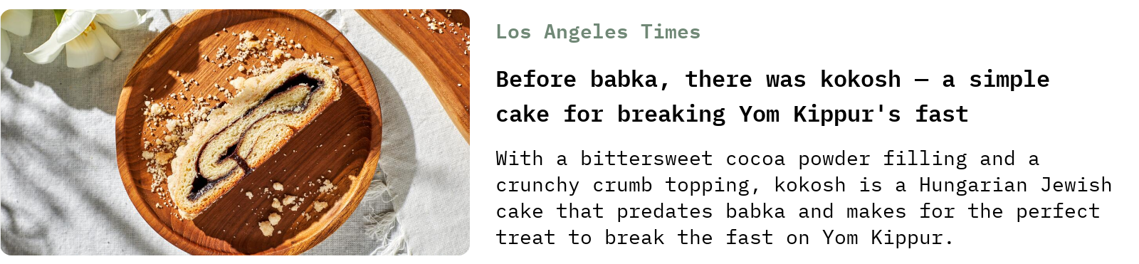 The LA Times Ben Mims on his search for the perfect recipe to bring to a Yom Kippur meal, and his discovery of kokosh, a delectable-looking mashup of strudel and babka: