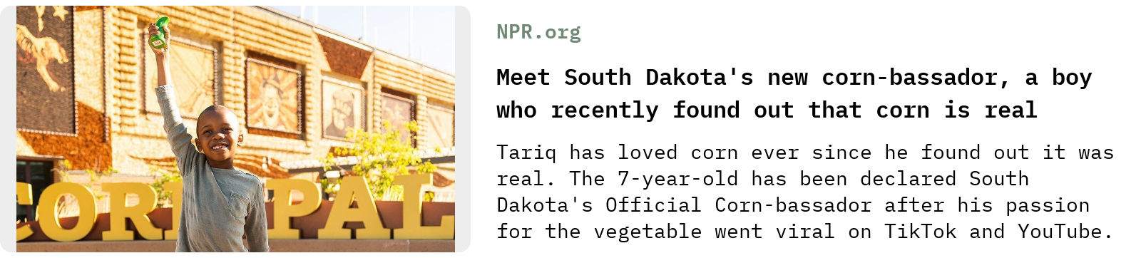 I’m no fan of South Dakota Governor Kristi Noem, but I appreciate her naming Tariq the Corn Kid her state’s first Corn-ambassador and bringing him and his family there for the ceremony:
