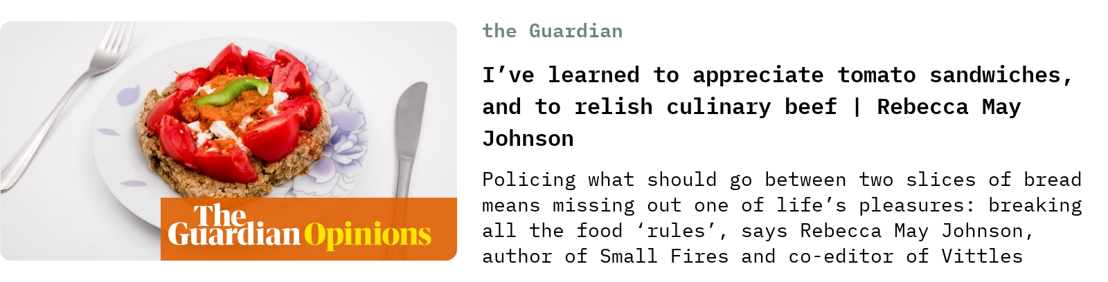 Rebecca May Johnson—whose new book Small Fires I love—used the tweet and its aftermath as an occasion to muse eloquently on the subject of culinary “rules” and how they only serve to keep us from the joys and solaces of the kitchen: